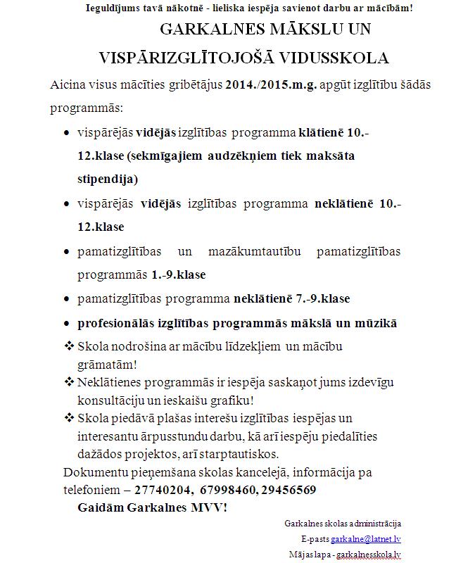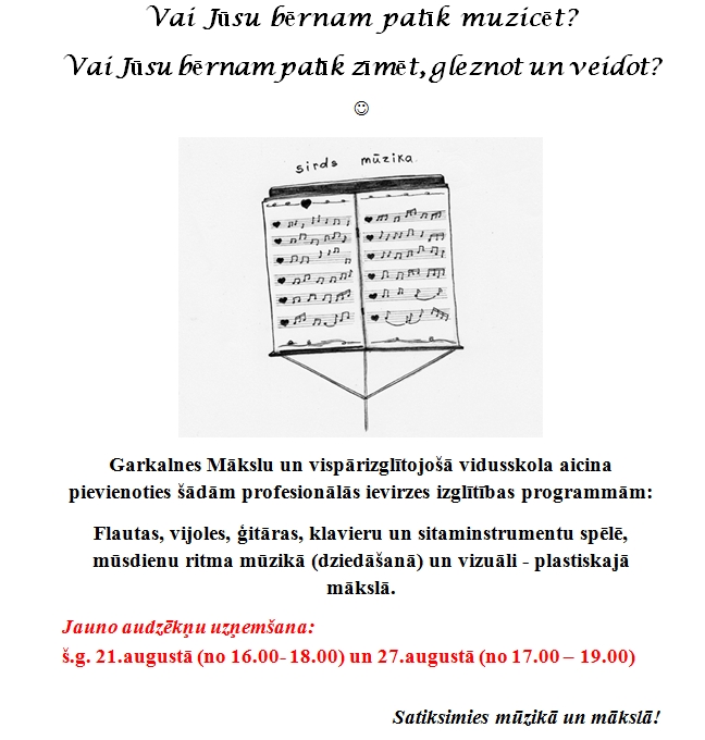 Garkalnes Mākslu un vispārizglītojošā vidusskola aicina