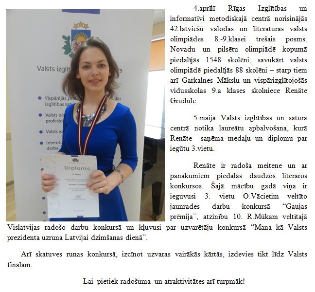 Renātei Grudulei 3. vieta valsts latviešu valodas un literatūras olimpiādē