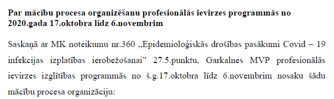 Par mācību procesa organizēšanu profesionālās ievirzes programmās no 2020.gada 17.oktobra līdz 6.novembrim