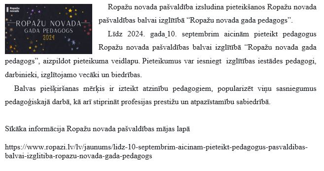 Līdz 10.septembrim var pieteikt pedagogus pašvaldības balvai izglītībā "Ropažu novada gada pedagogs"