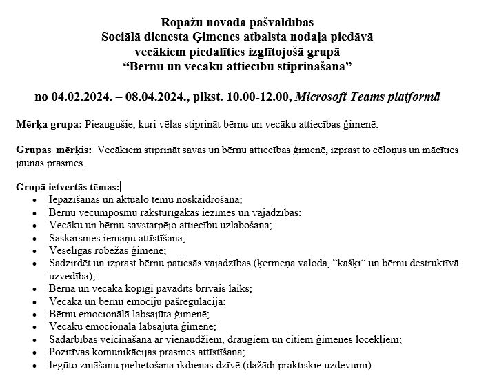 Aicina vecākus piedalīties izglītojošā grupā “Bērnu un vecāku attiecību stiprināšana”