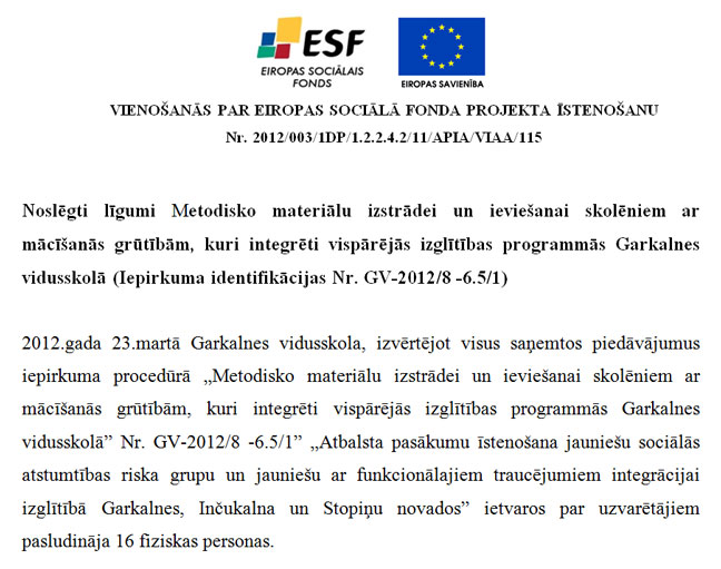 Noslēgti līgumi Metodisko materiālu izstrādei un ieviešanai skolēniem ar mācīšanās grūtībām, kuri integrēti vispārējās izglītības programmās Garkalnes vidusskolā